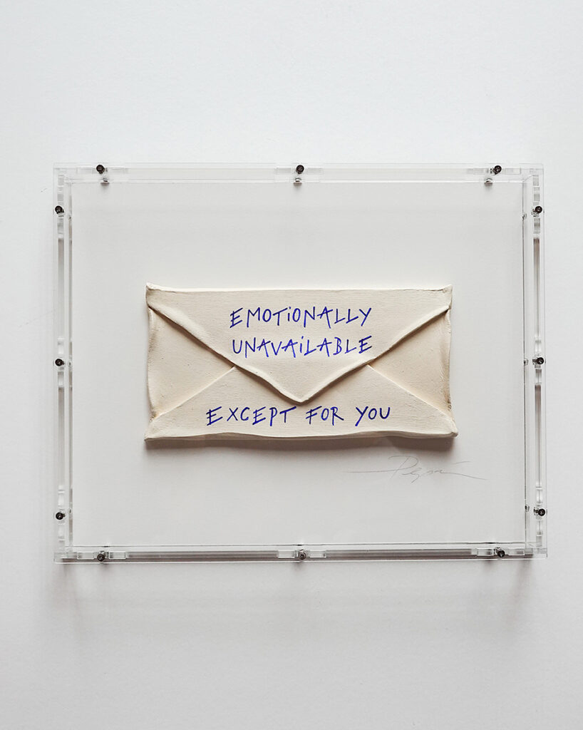 EMOTIONALLY UNAVAILABLE – EXCEPT FOR YOU LOVE LETTER SCULPTURE (2026) Handcrafted from clay, acrylic paint, framed in an acrylic glass case, 31 x 25 cm